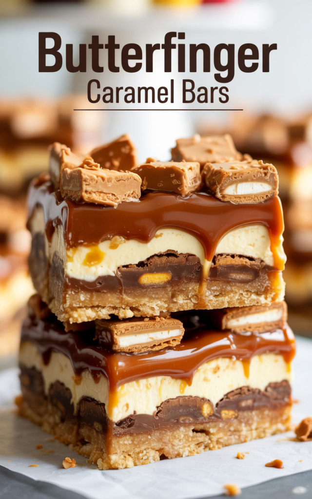 This recipe yields about 16 decadent bars. Each serving contains approximately 300–350 calories, packed with rich caramel, chocolate, and Butterfinger goodness—so they’re best enjoyed as an occasional treat!