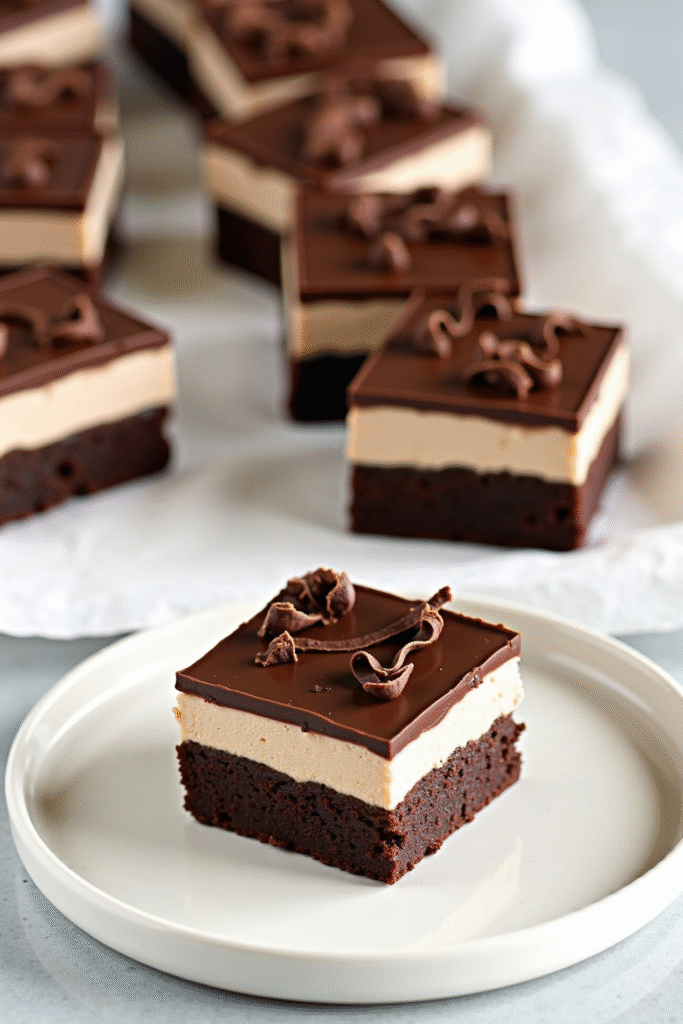 Serve these brownies chilled for maximum mousse stability. Pair each square with a scoop of vanilla ice cream, a swirl of whipped cream, or a fresh berry garnish for color and flavor contrast. Whether on a dessert buffet or featured as the highlight of a dinner party, Chocolate Mousse Brownies always make an impression.